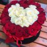 Искренним признанием в любви послужит фееричная композиция «Сердечный поцелуй» из белых и красных роз. Декоративная атласная ленточка нежно держит в объятиях черную коробку с выложенным из роз сердцем. Потрясающе красивая и гармоничная аранжировка покорит сердце дамы, будь то юная прелестница, дама постарше, мама, сестра или коллега, отмечающие знаковое событие или юбилей.